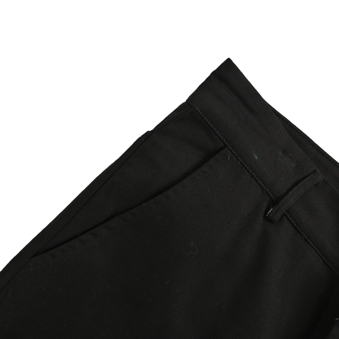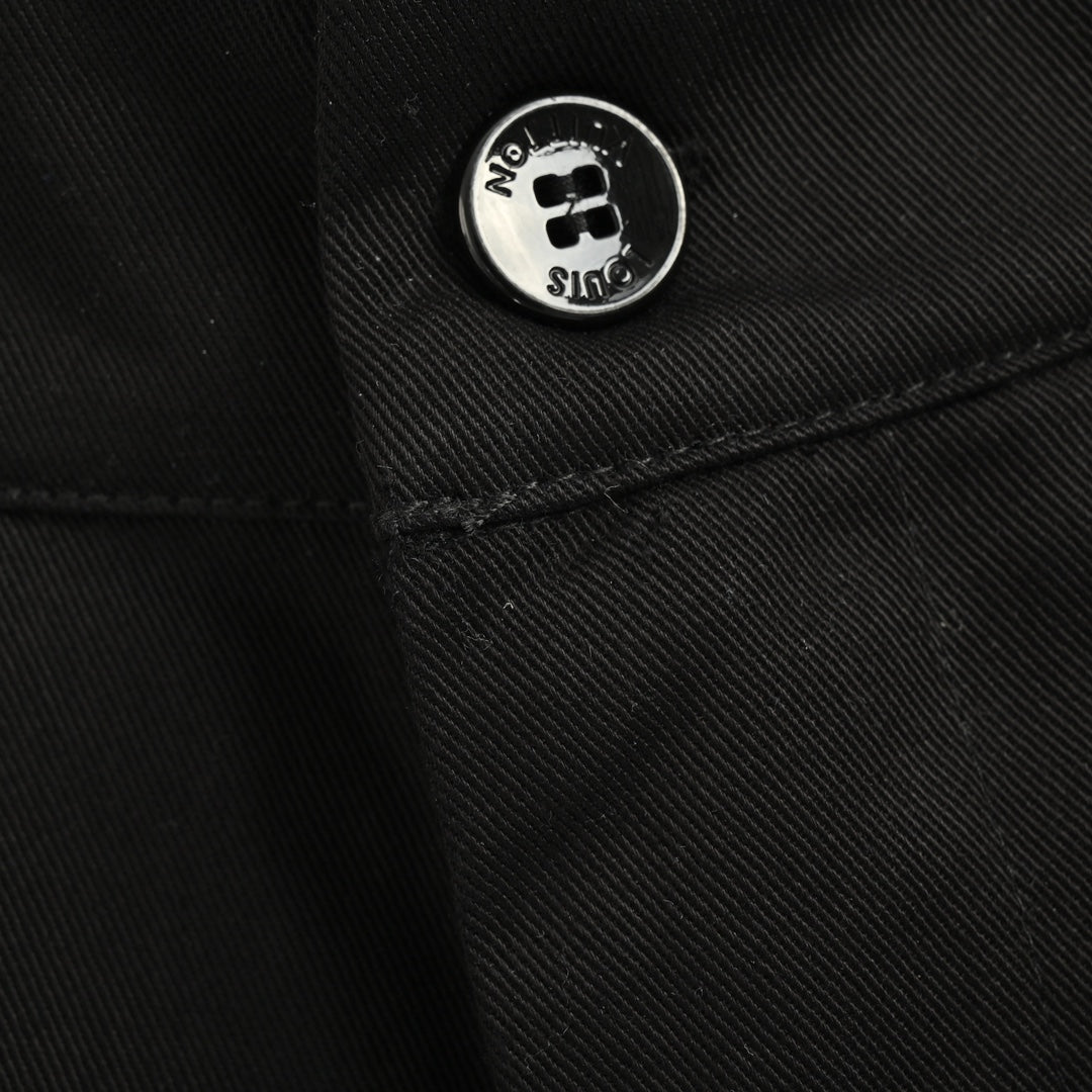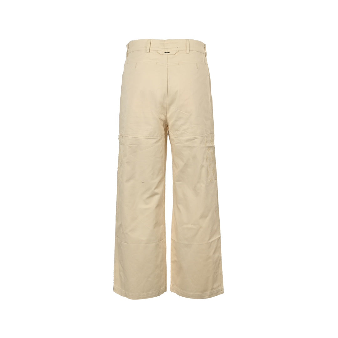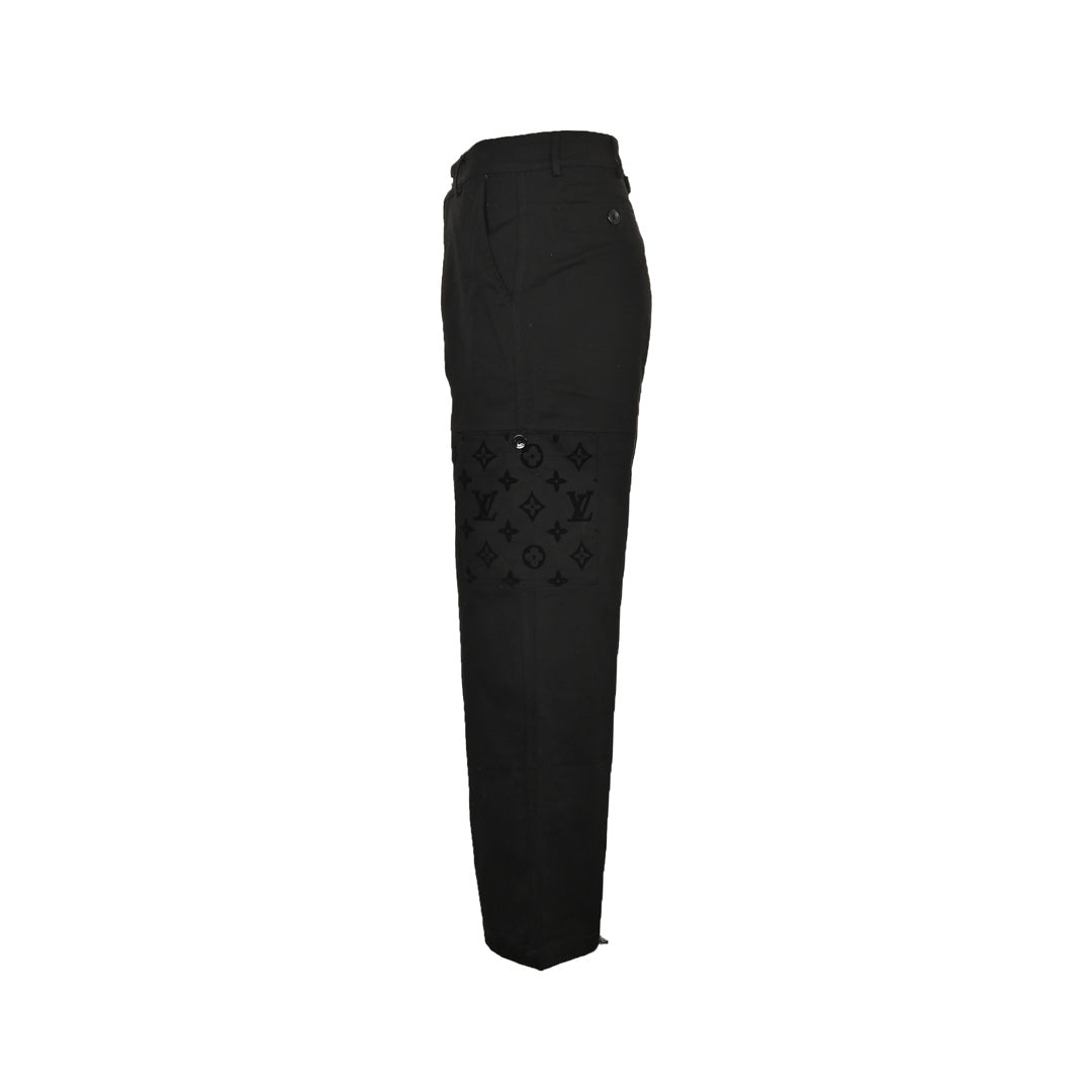Tissu sergé, logo Monogram floqué sur les poches avant, pattes Staples au dos avec clous carrés à devise, doublure en sergé de coton blanc avec logo imprimé en pâte de gomme, procédé identique sur le tissu des poches. La taille, l'espacement et les rangées de fleurs du motif classique à l'ancienne ont été réalisés à la main. Un molleton de polyester est utilisé pour créer la figure finale en papier floqué sur un papier spécial traité par sublimation thermique.