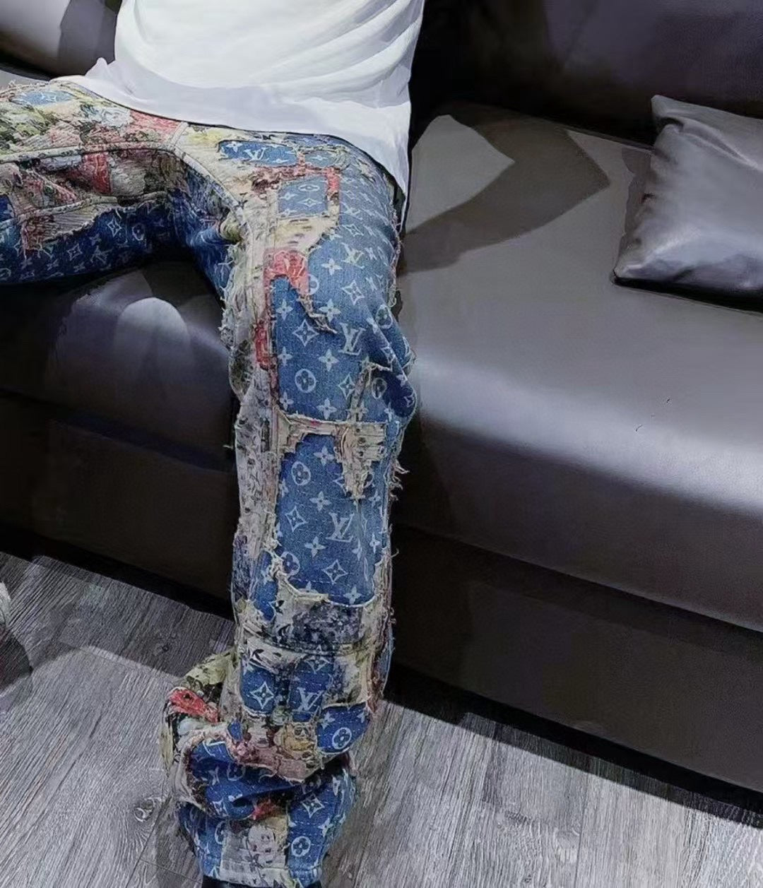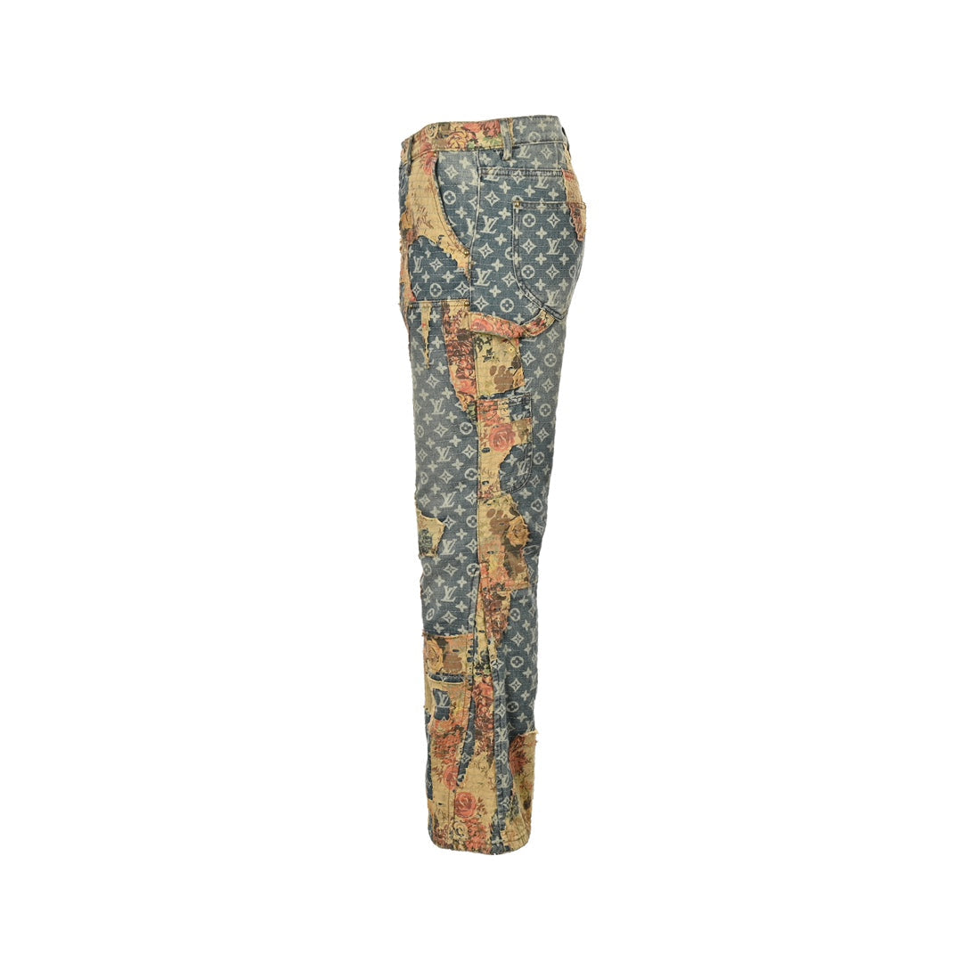 Le tissu de base exclusif, tissé sur mesure, est complété par un tissu supérieur floral imprimé numériquement. La machine à quilter a créé un motif de couture matelassé témoignant d'un savoir-faire artisanal de haut niveau. La finition vieillie délavée résistante permet des effets de décoloration et de destruction. Ornés d'éléments floraux, ces deux pièces affichent une forte influence vintage, illustrant parfaitement la rencontre entre mode et personnalité. Jean vintage patchwork floral pour homme et femme. Coupe décontractée avec un délicat patchwork appliqué, incluant un appliqué dévoré laser ultra-complexe avec un appliqué floral personnalisé exclusif. Ce pantalon présente un magnifique motif floral unique, réalisé grâce au procédé de broderie Tajima importé, qui nécessite 200 000 points de broderie minutieuse par pièce. Motif à carreaux en coton intercalaire en forme de losange, contrastant parfaitement avec le procédé de la ligne, ainsi qu'une gravure délavée résistante, une coupe précise et délicate. Unisexe