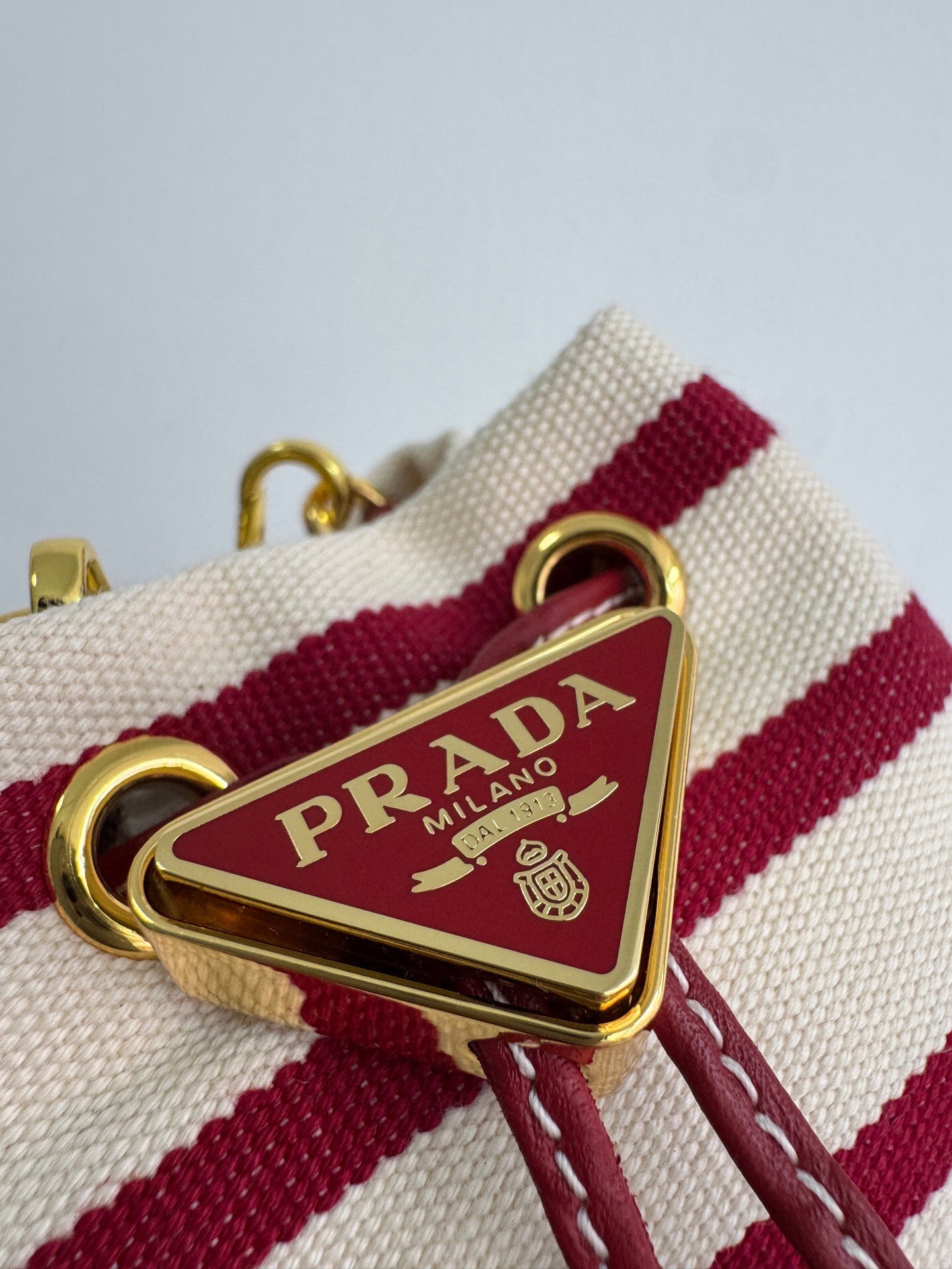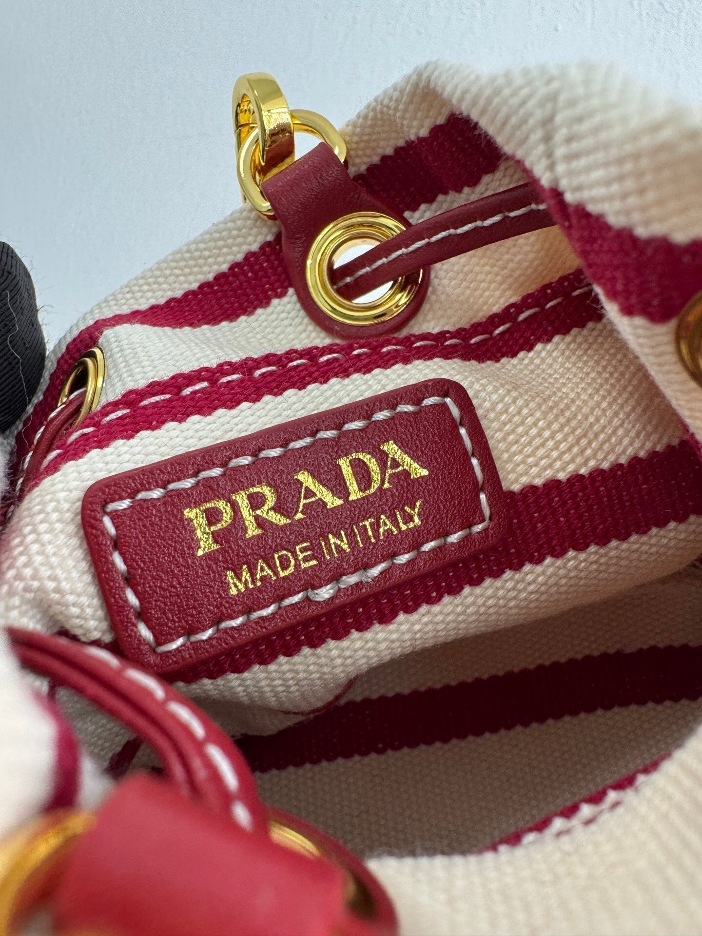 Envie d'un mini sac à la fois ludique et raffiné ? Ce mini sac seau en toile rayée offre des rayures rétro, des accessoires dorés de luxe et un design compact qui est secrètement fonctionnel (oui, il contient vos essentiels !).