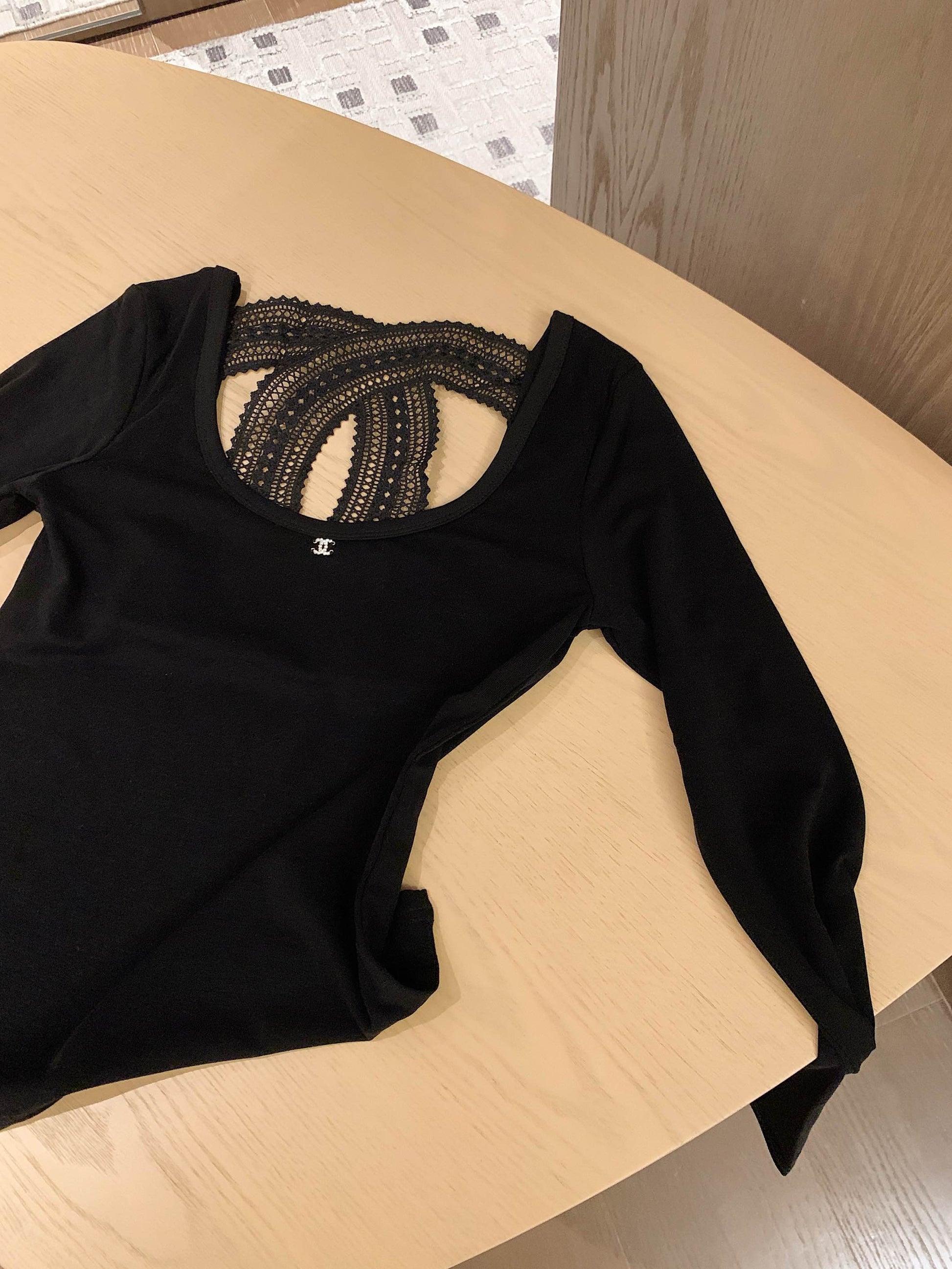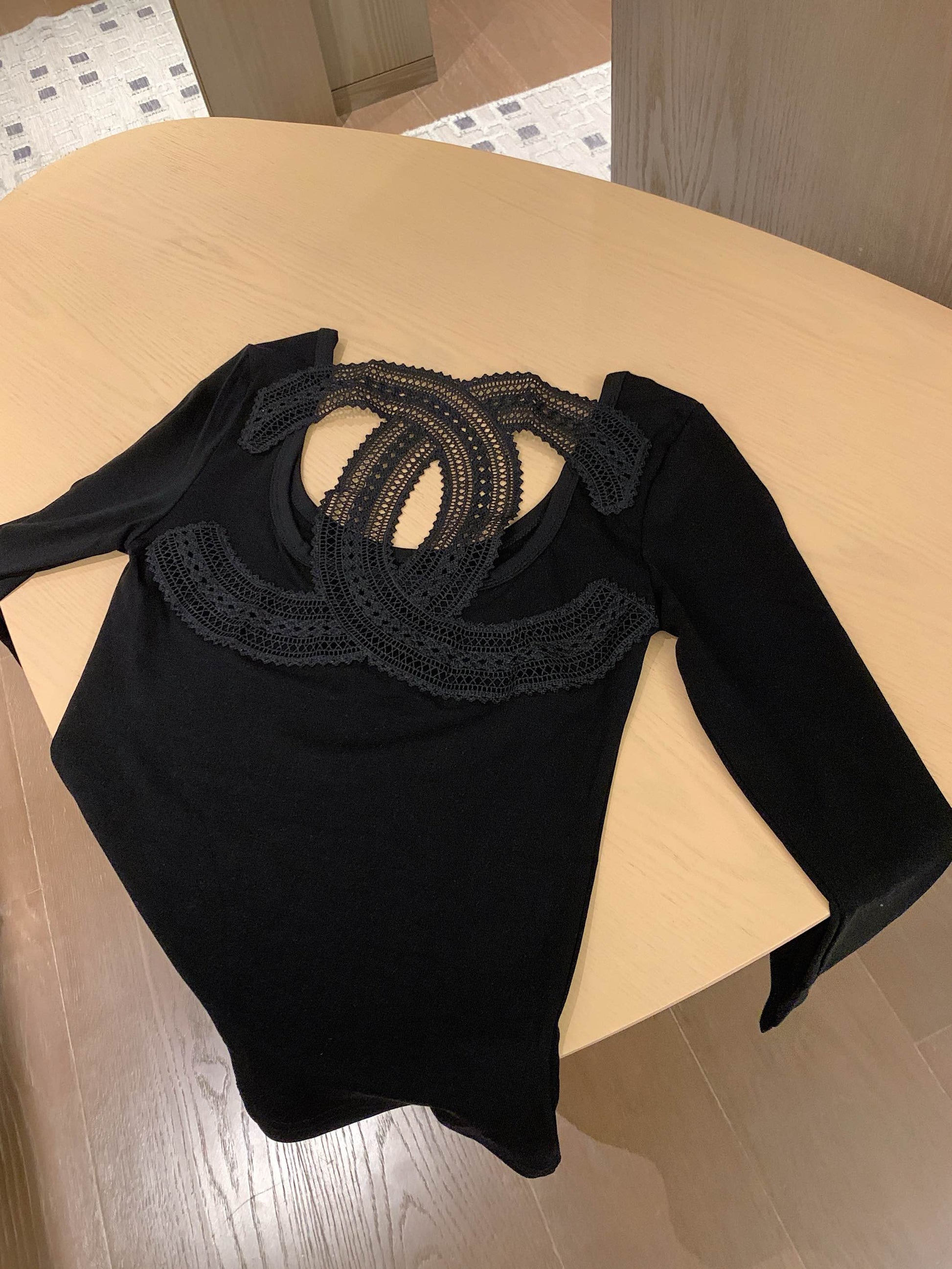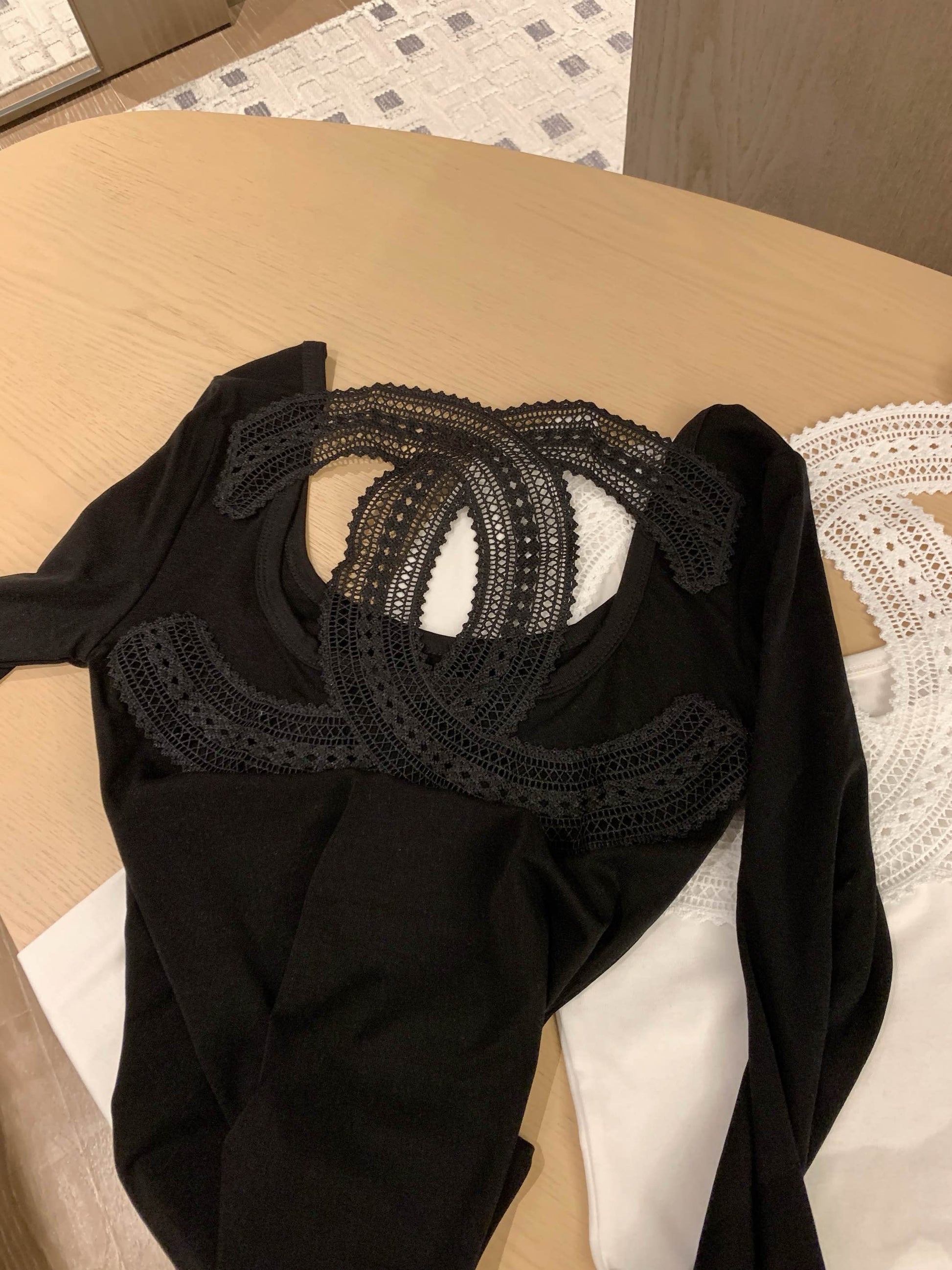 Une pièce tendance, exclusive et inédite. Ce pull sur mesure, à col en dentelle superposée et à découpes, est confectionné en fil YB importé pour un look haut de gamme, confortable et doux. Son encolure ronde et ses manches longues sont ornées de bordures en dentelle, créant un col superposé et des poignets évasés qui complètent son allure aristocratique et lui confèrent une touche amincissante et féminine. La maille ajourée sur l'ensemble est élégante et sexy. Le logo double C en 3D sur la poitrine fait écho aux boutons de manchette, soulignant son positionnement haut de gamme et son côté tendance. Sa coupe classique lui confère une allure douce, sereine et raffinée.