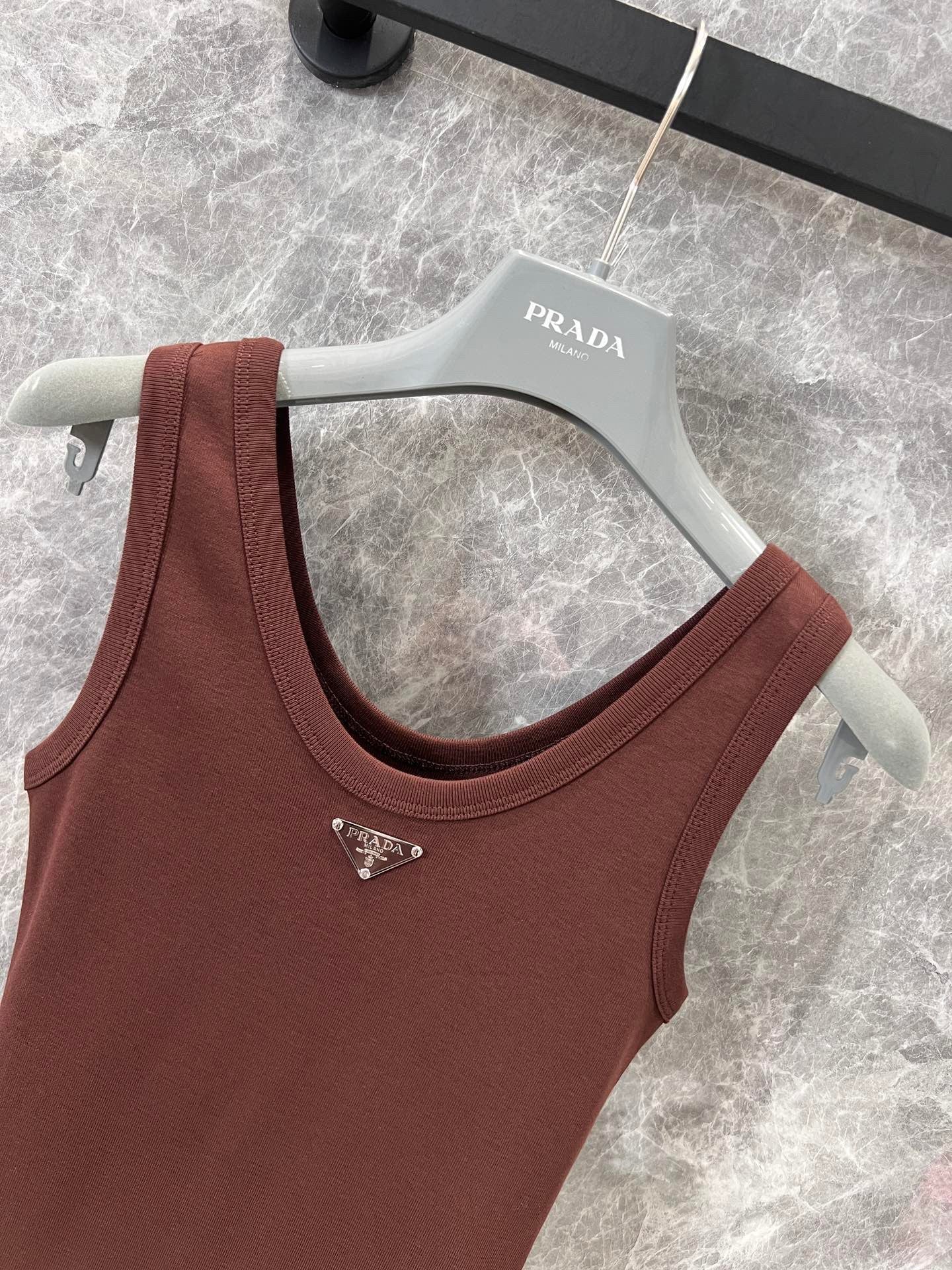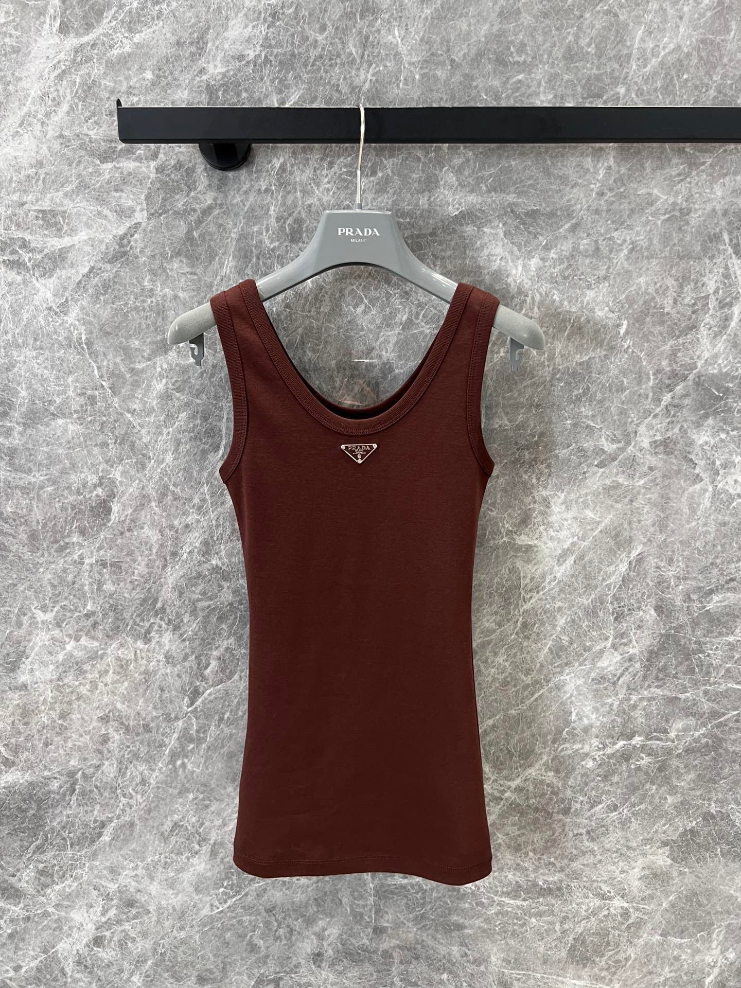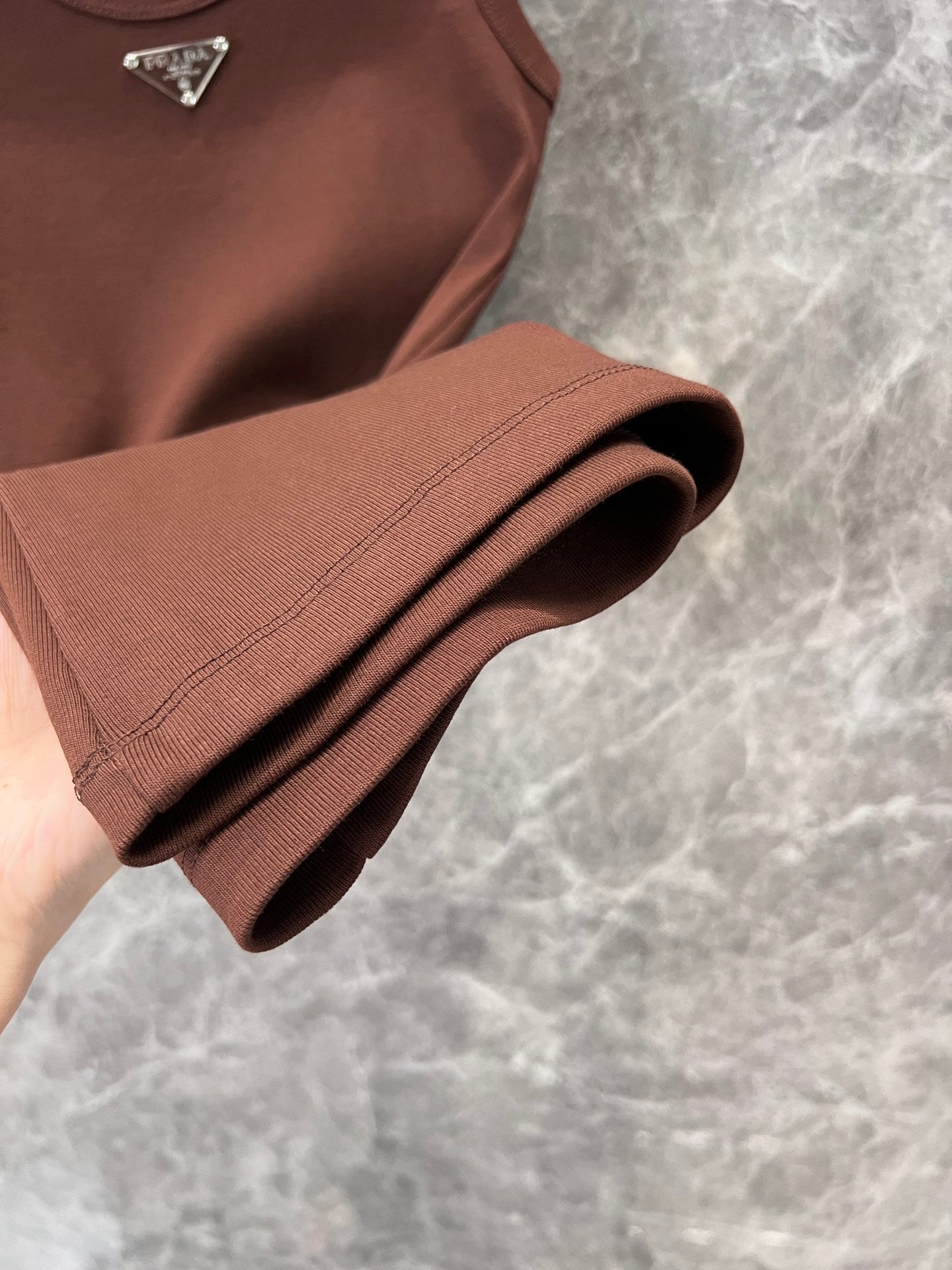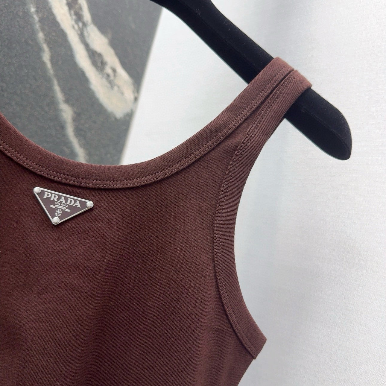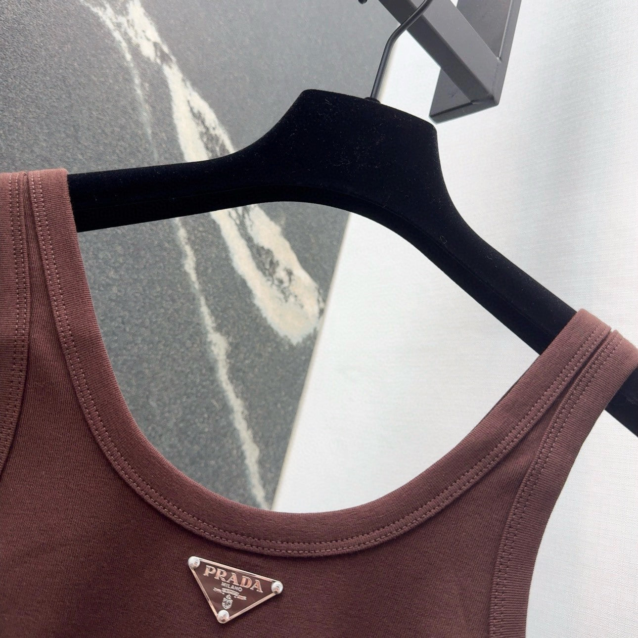 This chocolate ribbed tank transforms simplicity into sophistication — a fluid U-neck skims the collarbones, while a delicate geometric emblem at the chest adds a whisper of refinement. The body-hugging ribbed knit sculpts curves with understated precision, making it a silent powerhouse in any wardrobe.