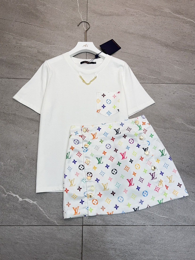 These monogram co-ord sets detonate luxury’s quiet codes — crisp white and bold black tees collide with kaleidoscopic monogram skirts, fused by gold chain necklines and hardware that crackle with modern irreverence. The tee’s pocket borrows a splash of the skirt’s neon-bright pattern, while the skirt’s metal buttons punctuate its colorful chaos, forging a dialogue between legacy and rebellion.