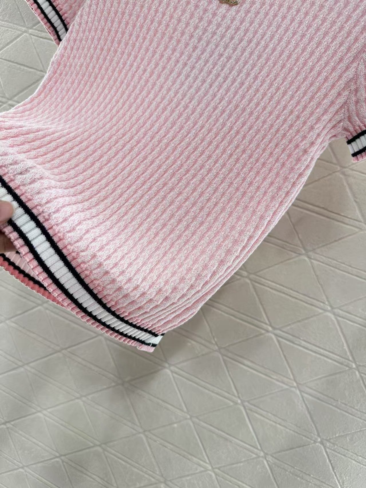 , high-end texture and comfort, full of elasticity, round neck short sleeves, striped edges are decorated on the neckline hem and cuffs, with three-dimensional double C brooch decoration, highlighting the brand personality, highlighting the high-end sense of wear, elasticity throughout the body, more exquisite, not limited to body shape, vertical pit stripes make the wear more slimming, showing a relaxed tone, light luxury and fashionable temperament, the first choice for fashionable wear in all seasons