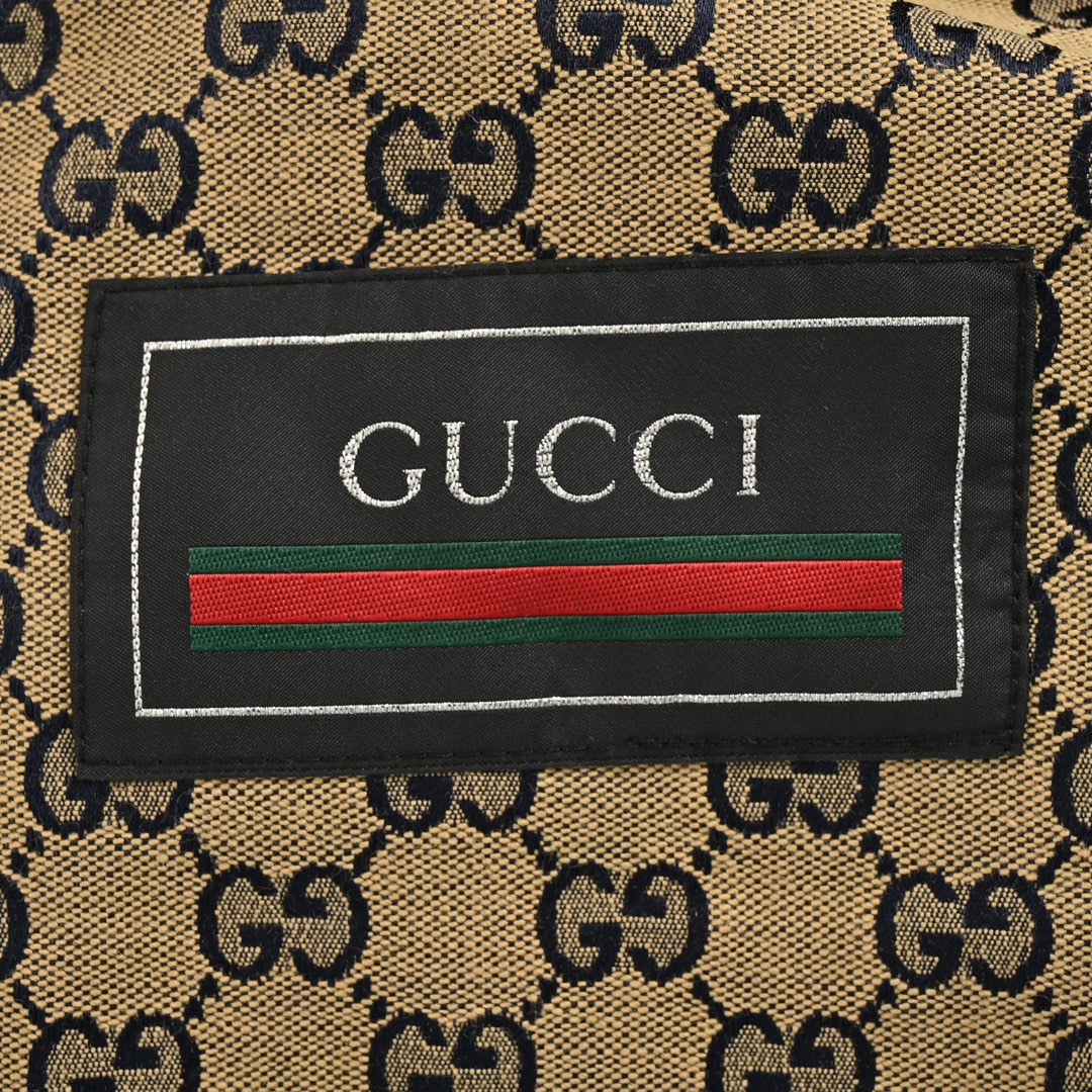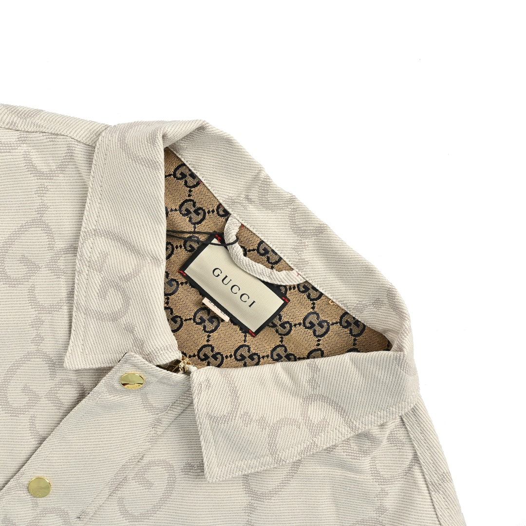 This jacket is made of ivory white denim, with red and green striped webbing on the cuffs and beige and ebony GG canvas details.