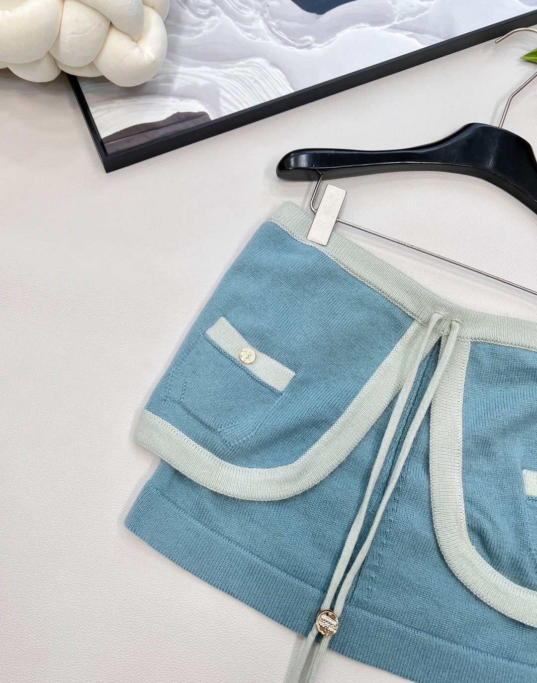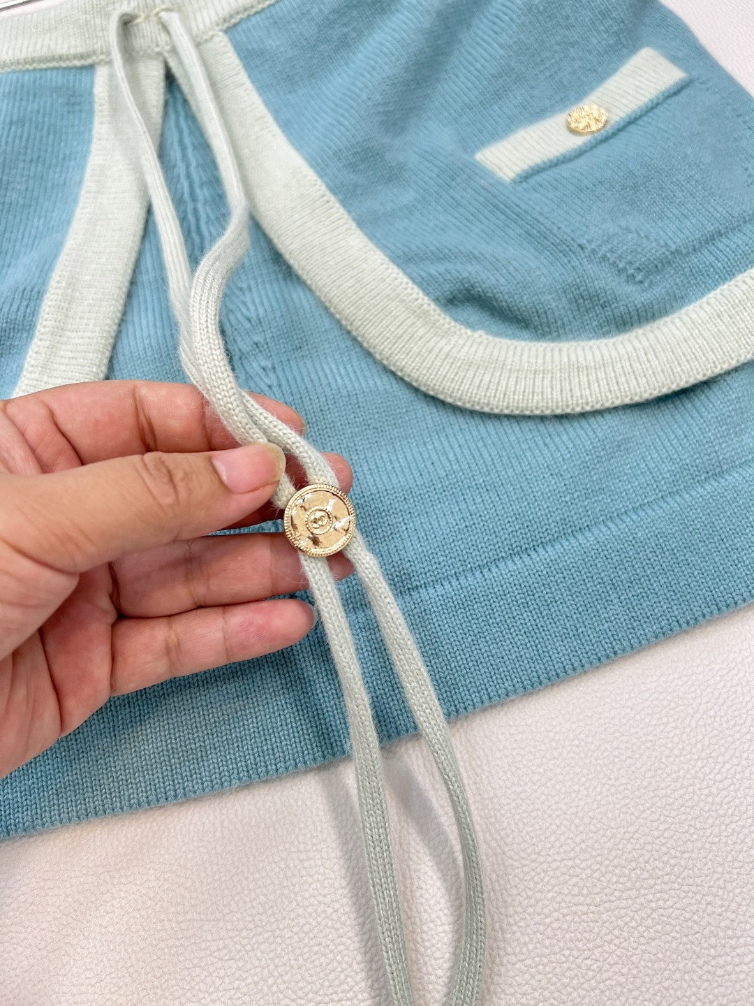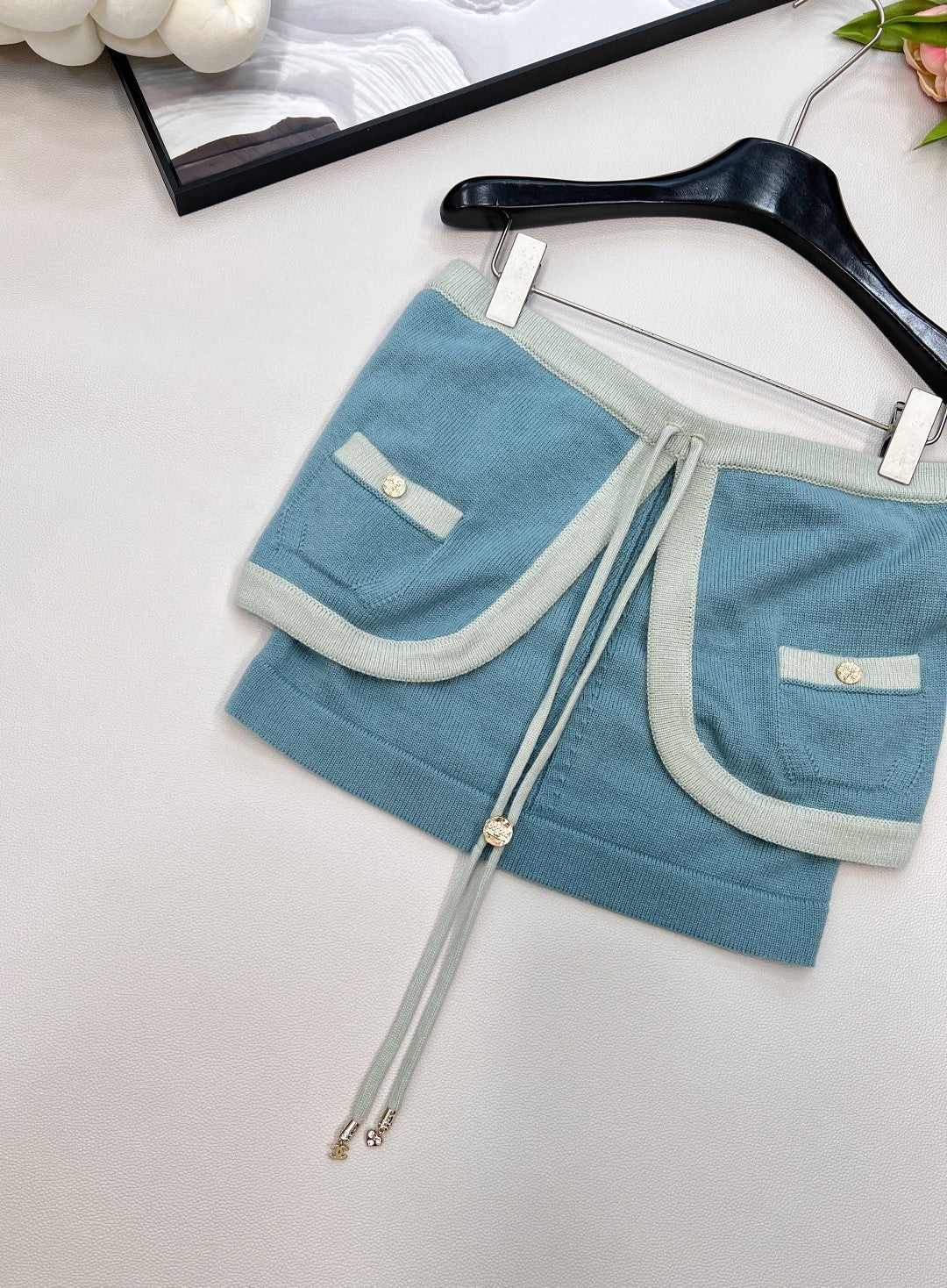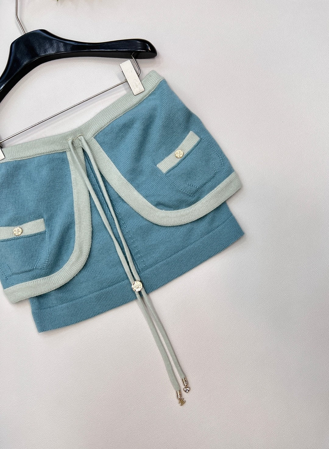 - Knit Skirt Sophistication: A soft blue knit mini, framed by mint contrast trim and adorned with gilded buttons, whispers couture elegance. Playful drawstrings add a flicker of modern rebellion, balancing structure with ease.