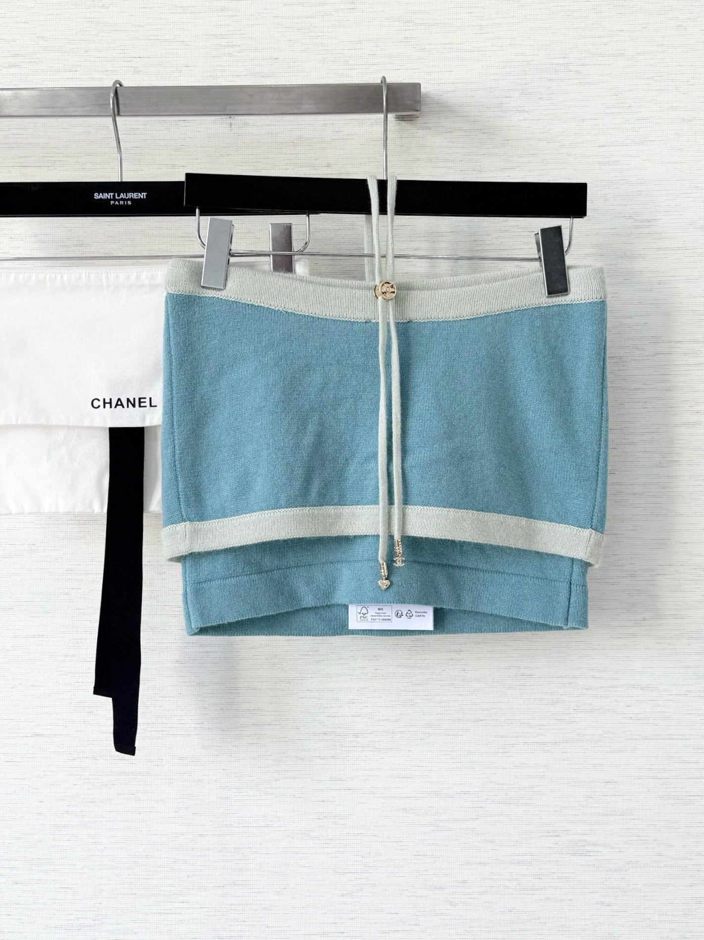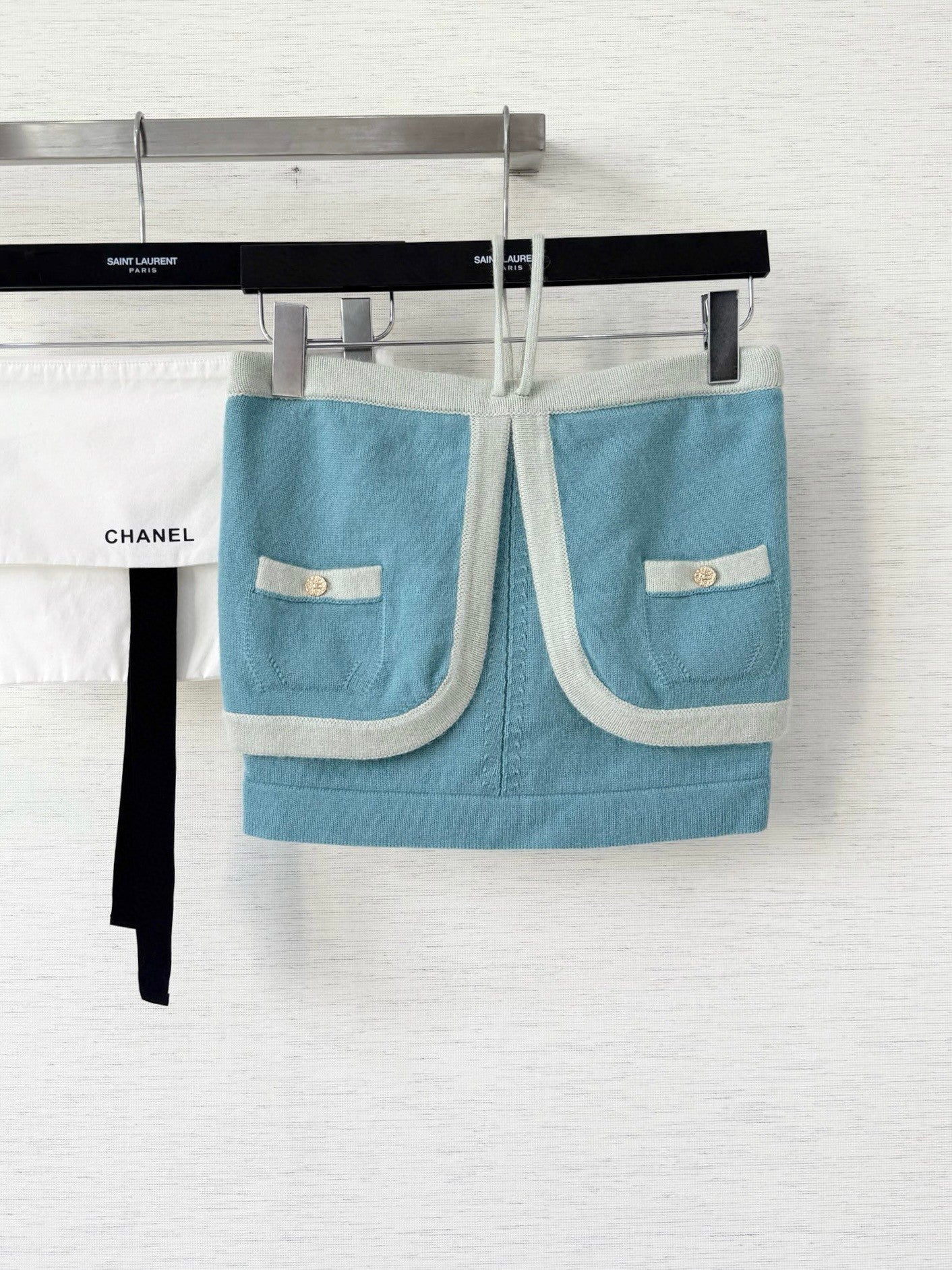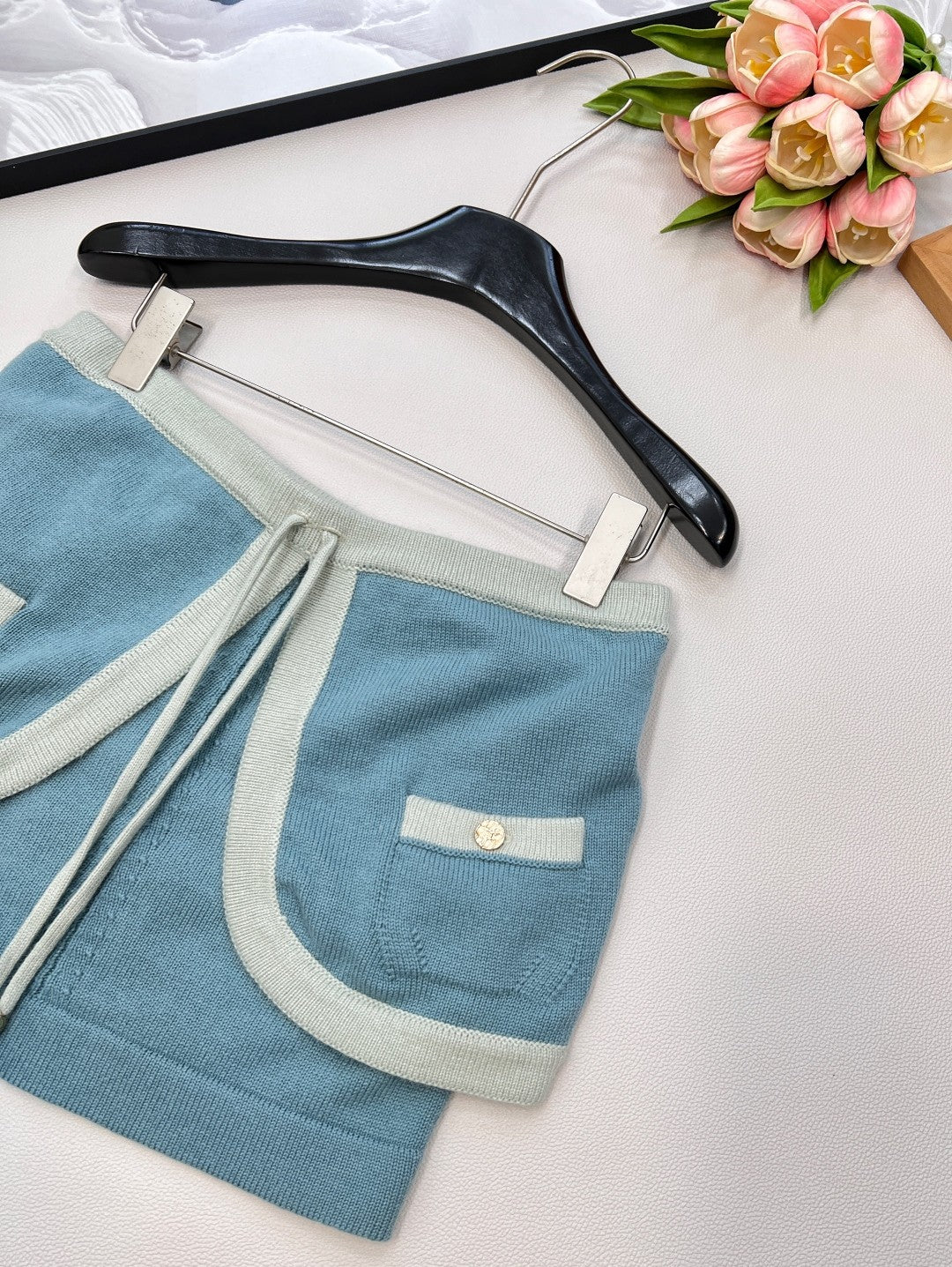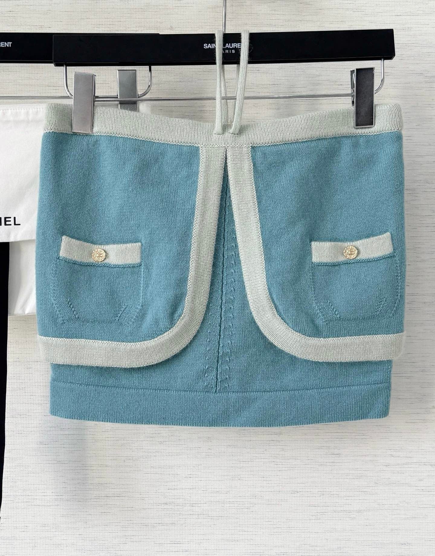 - Knit Skirt Sophistication: A soft blue knit mini, framed by mint contrast trim and adorned with gilded buttons, whispers couture elegance. Playful drawstrings add a flicker of modern rebellion, balancing structure with ease.