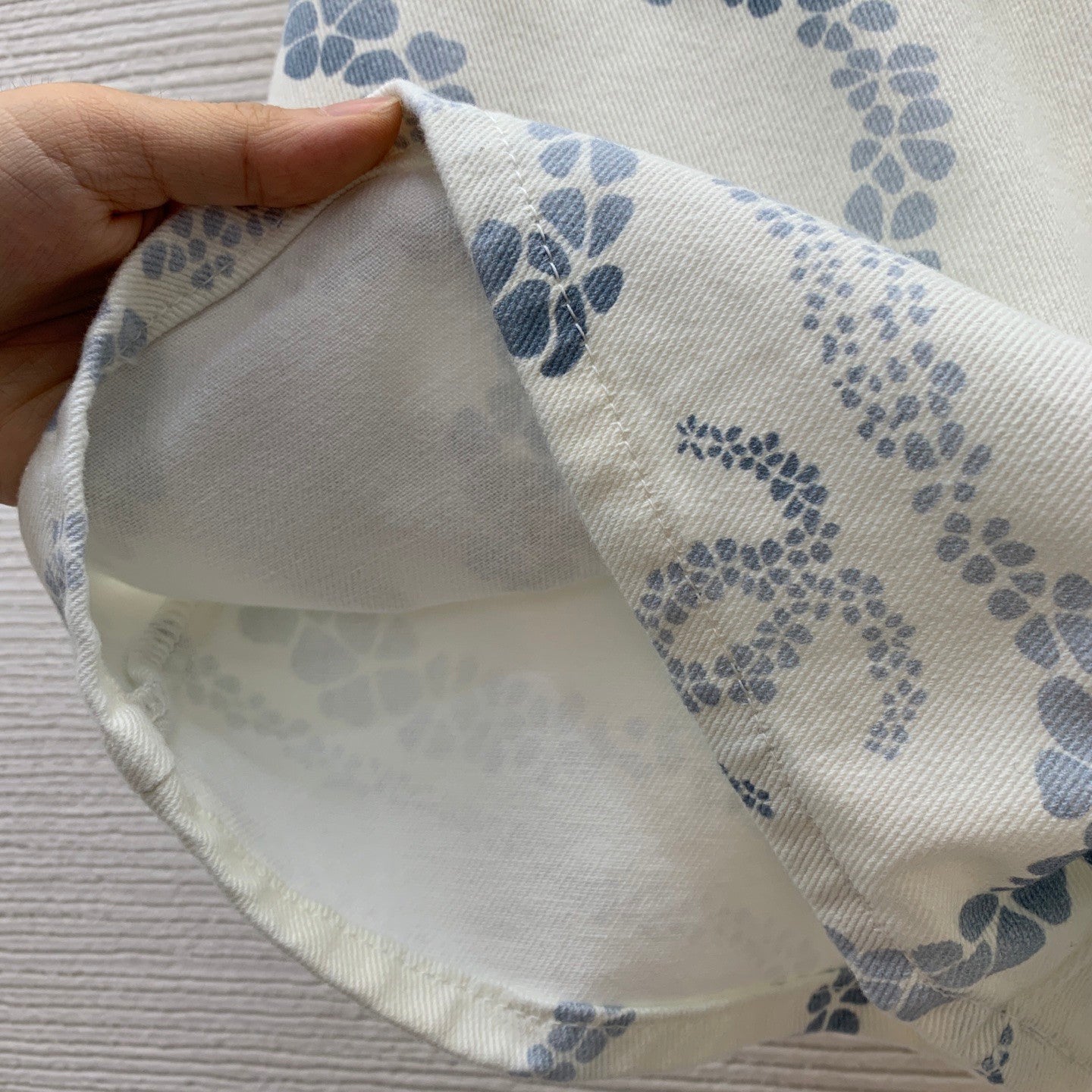 - Printed Denim Rebellion: Washed white denim, splashed with delicate blue motifs (echoing nature’s whimsy), nods to casual cool — a canvas of laid-back charm, reborn as artistic statement.