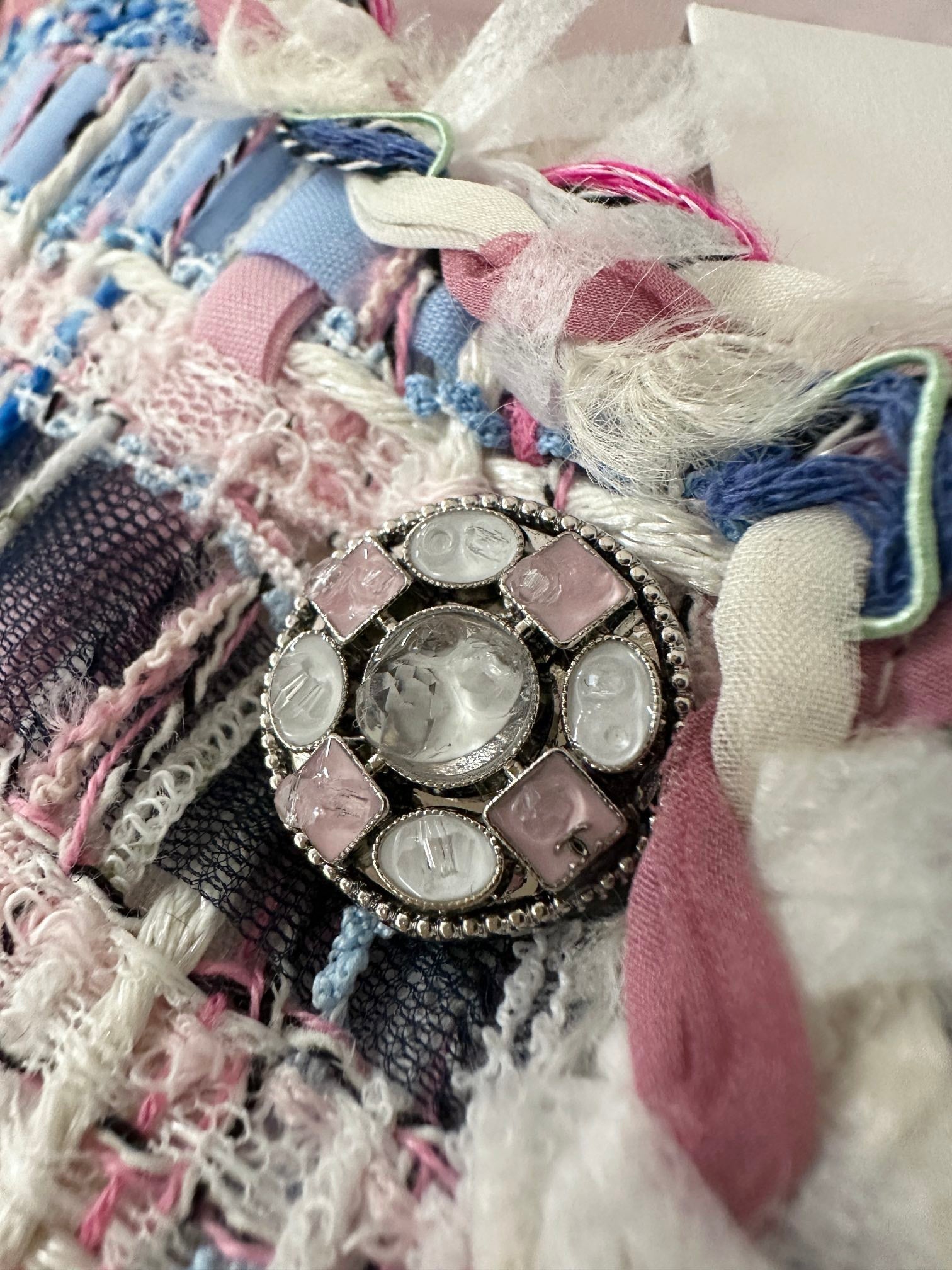 - Ornate Hardware: Vintage-inspired buttons (adorned with faceted crystals and pastel enamel) anchor the front, their jeweled opulence contrasting the tweed’s rough-hewn charm. A riot of elegance in the midst of chaos.