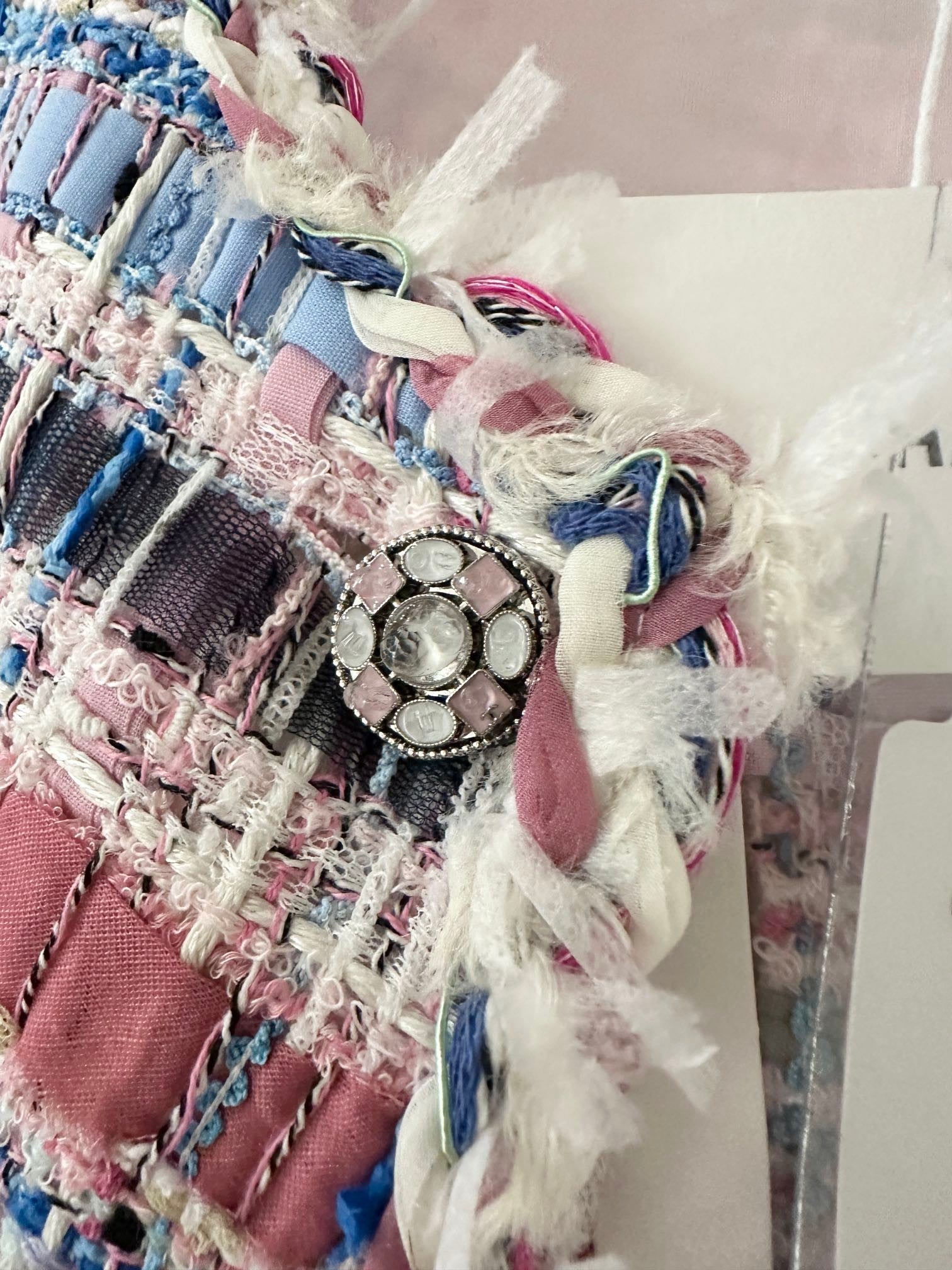 - Tweed Heritage: The pastel tweed weave, a nod to couture’s timeless legacy, is deconstructed into a chaotic patchwork of pinks, blues, and grays — classic craft, reborn as artistic anarchy.