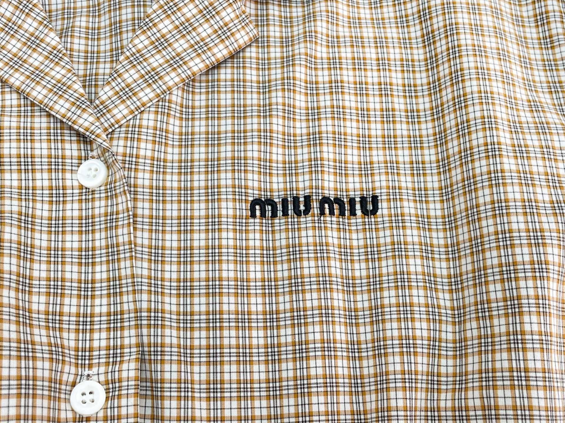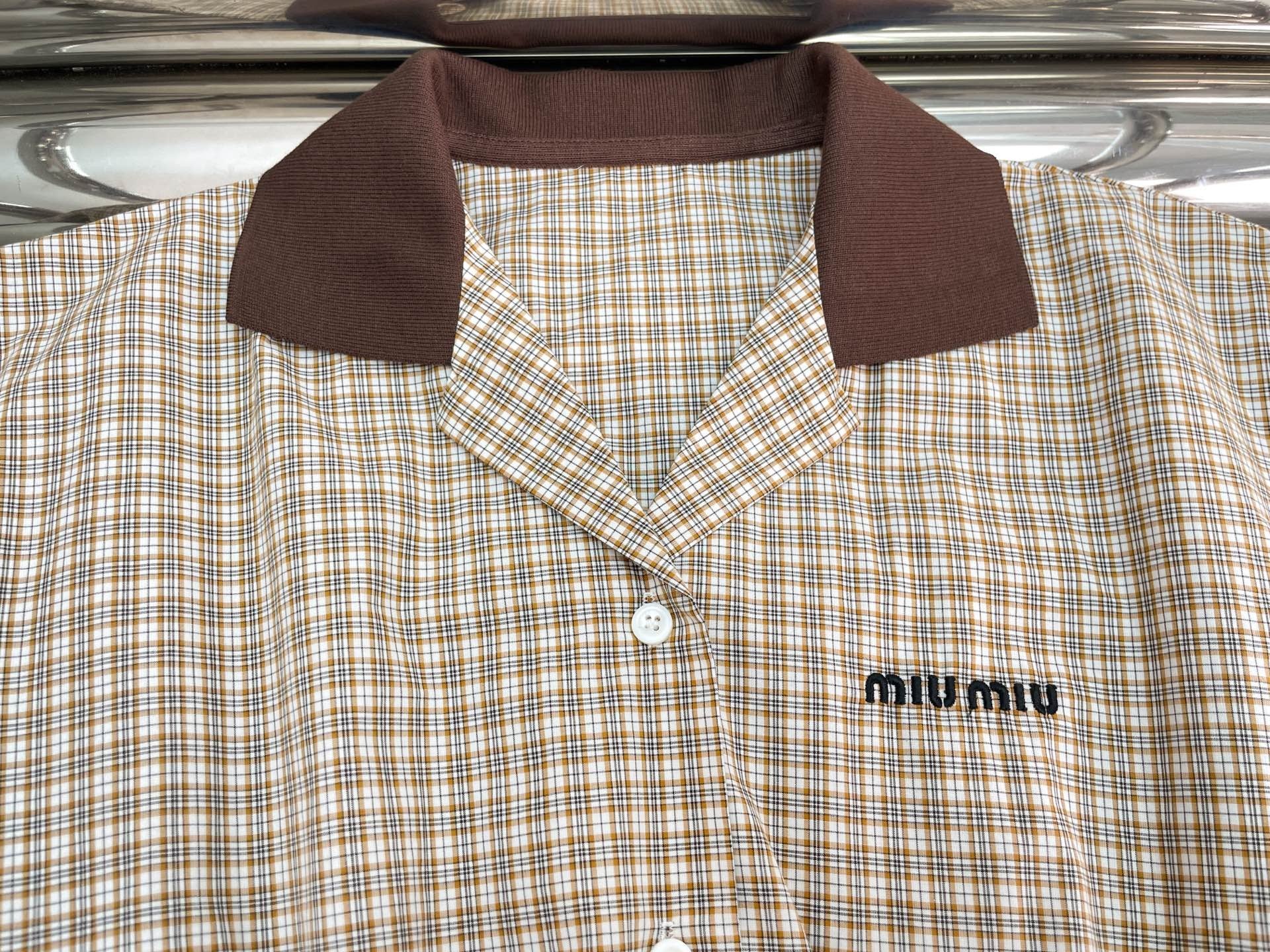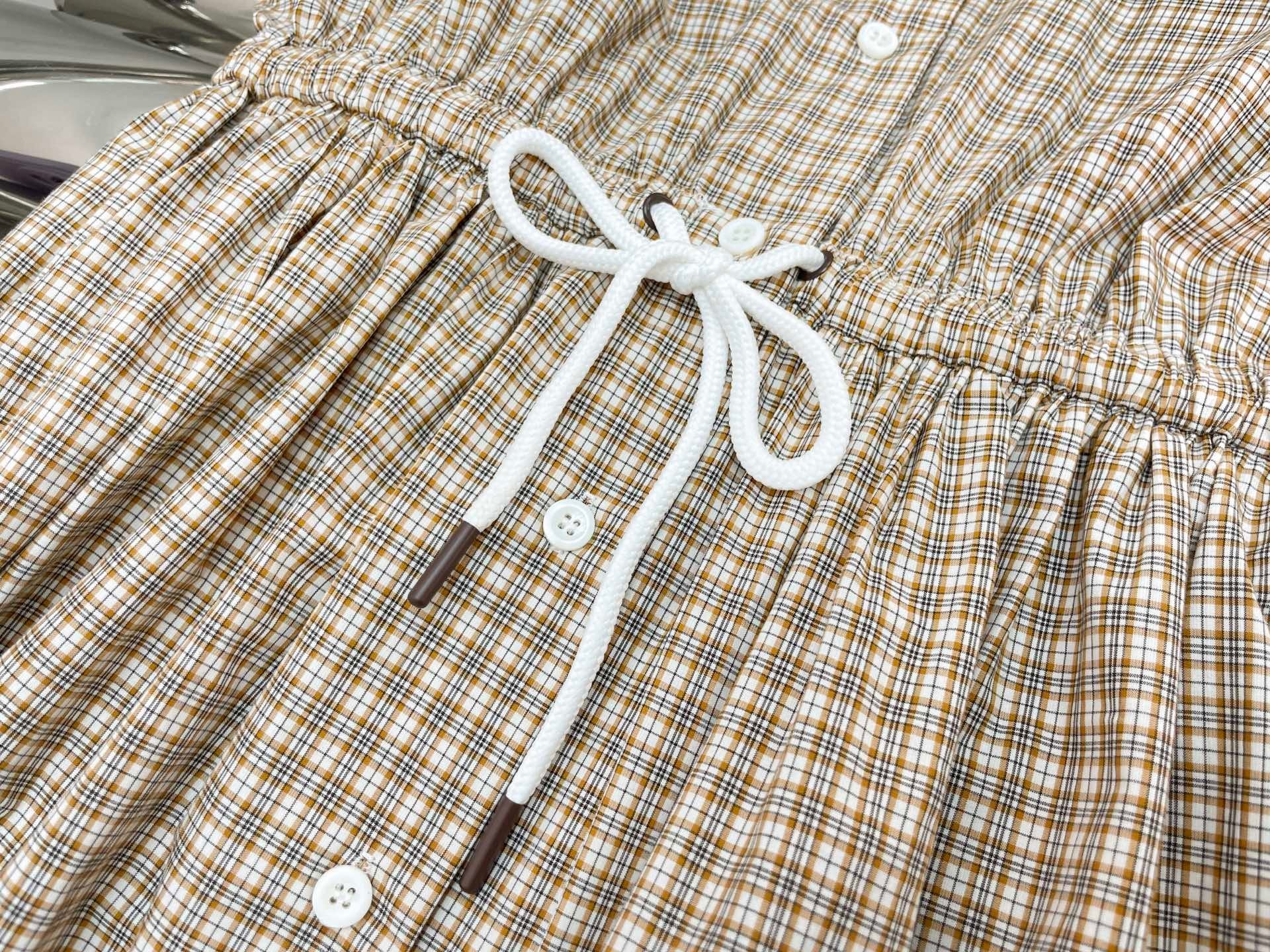 This tan-and-white plaid shirt dress merges academic nostalgia with modern allure — a deep brown contrast collar frames the neckline, while a drawstring waist sculpts the silhouette. Button-front styling and a subtle embroidered logo anchor the look, creating a dialogue between vintage preppy vibes and contemporary refinement.