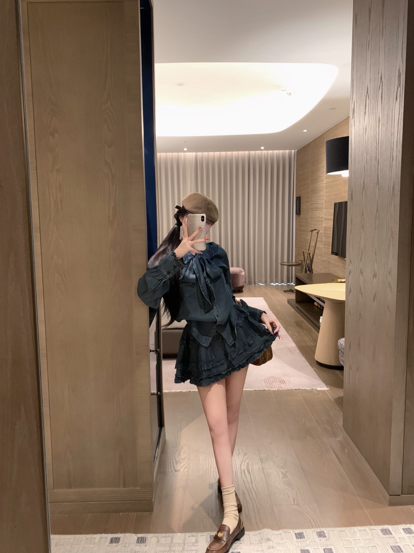 Ruffle-hem Tencel denim shirt and youthful skirt set~~High-quality