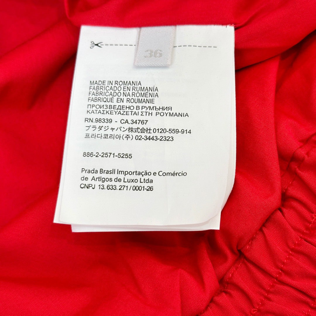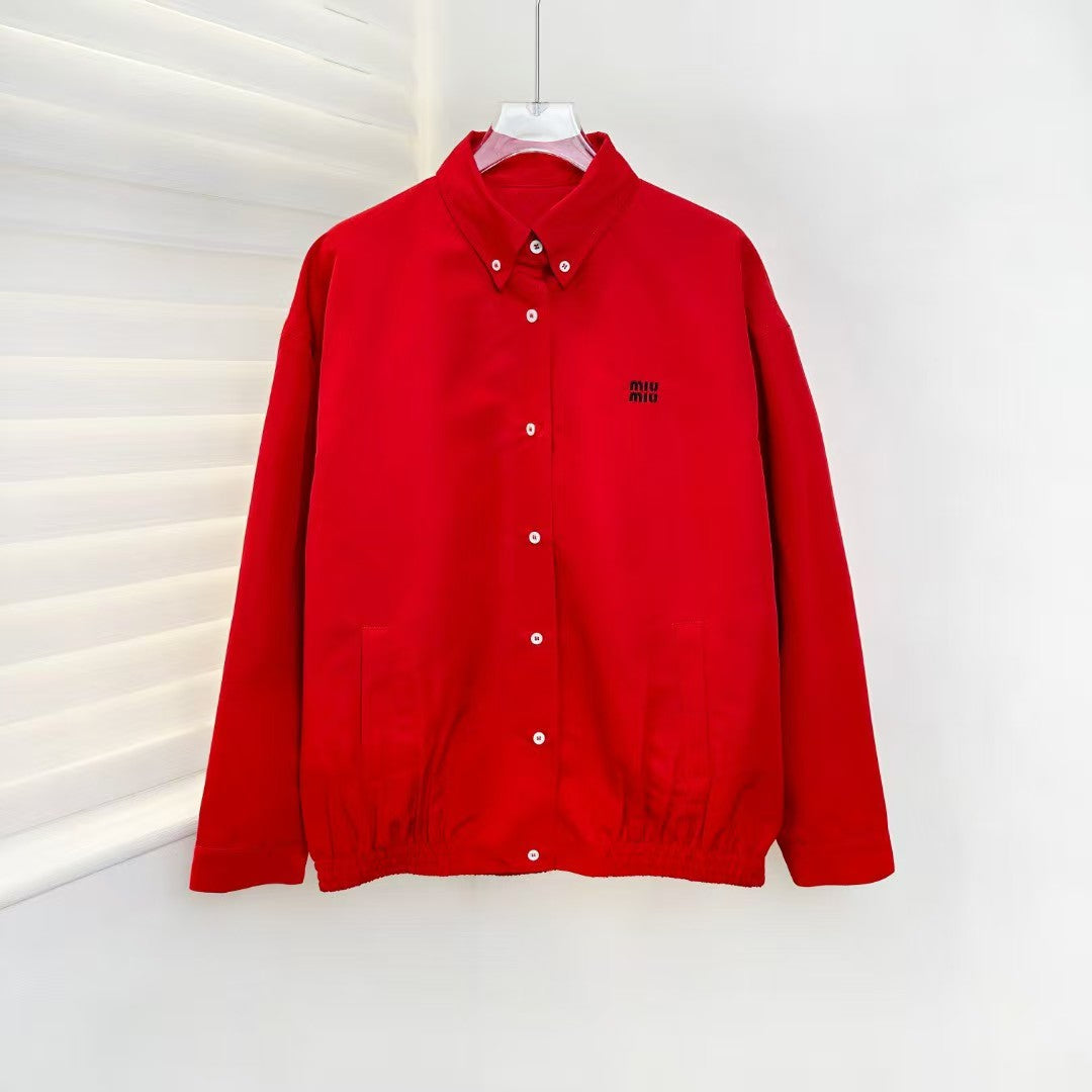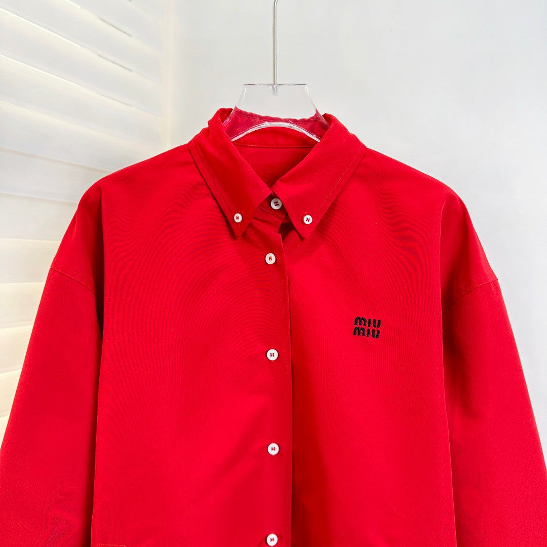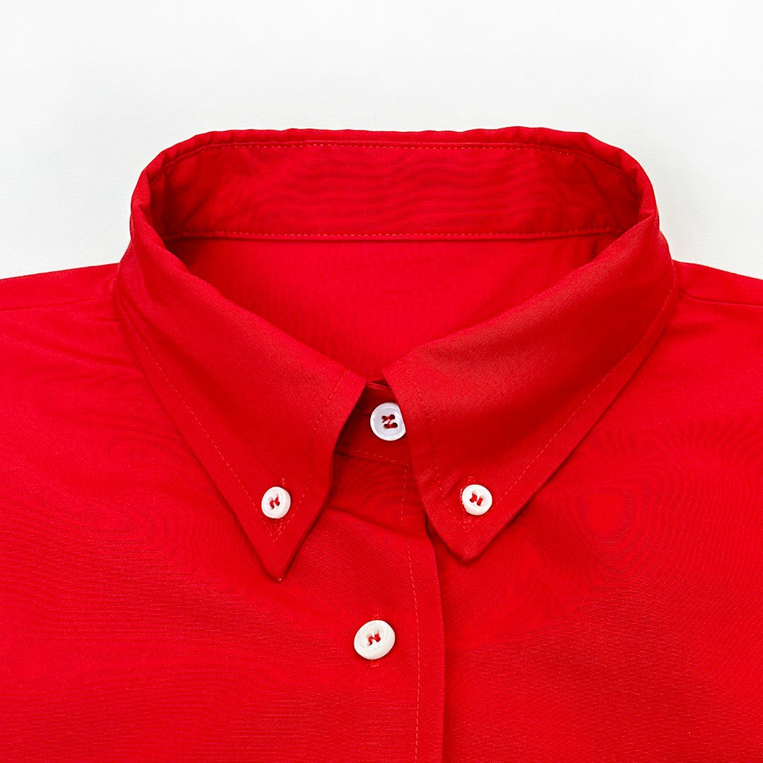 - Clean button-front silhouette + white contrast buttons = architectural precision, elevating the bold red canvas with graphic contrast.