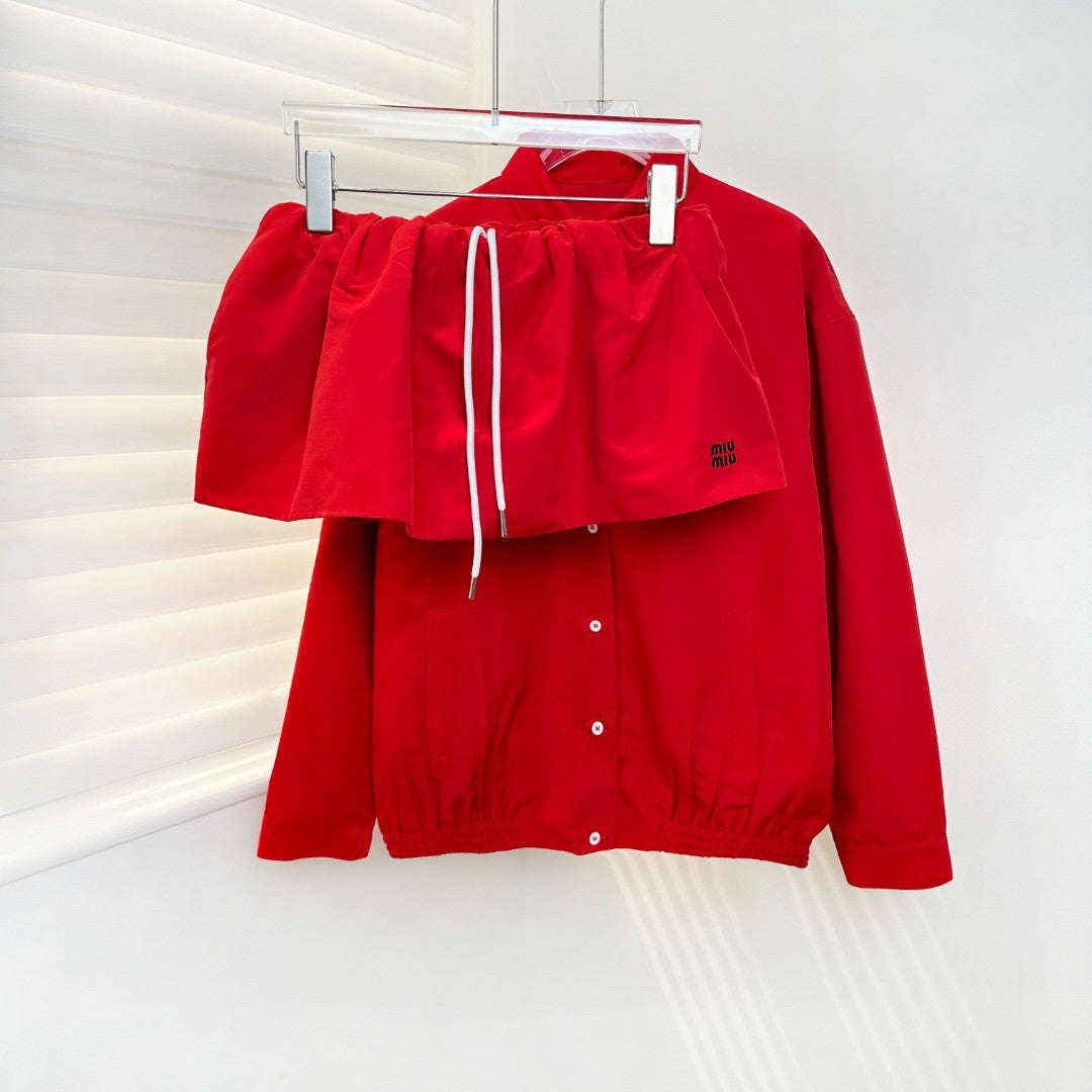 This crimson co-ord set redefines casual confidence — a crisp button-up shirt (adorned with white contrast buttons and subtle brand embroidery) pairs with drawstring shorts (boasting voluminous ruches and adjustable ties). It’s a dialogue between structured refinement and laid-back fluidity, unified by the electrifying intensity of scarlet.