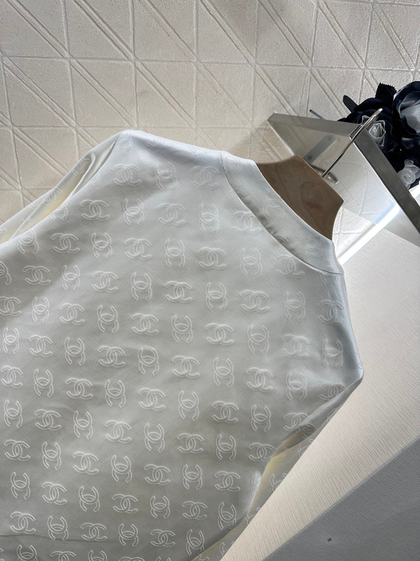 Custom YB silk cotton jacquard material offers a premium feel, smooth and comfortable, and a crisp, stylish look. The straight-shoulder, round-neck shirt jacket silhouette features an all-over double-C jacquard pattern, creating a simple yet stylish look while showcasing the brand's premium style. The front of the jacket features a button-down placket and symmetrical pockets. Rich in detail, the clean, flattering silhouette effortlessly exudes sophistication and elegance. Perfect for everyday wear.