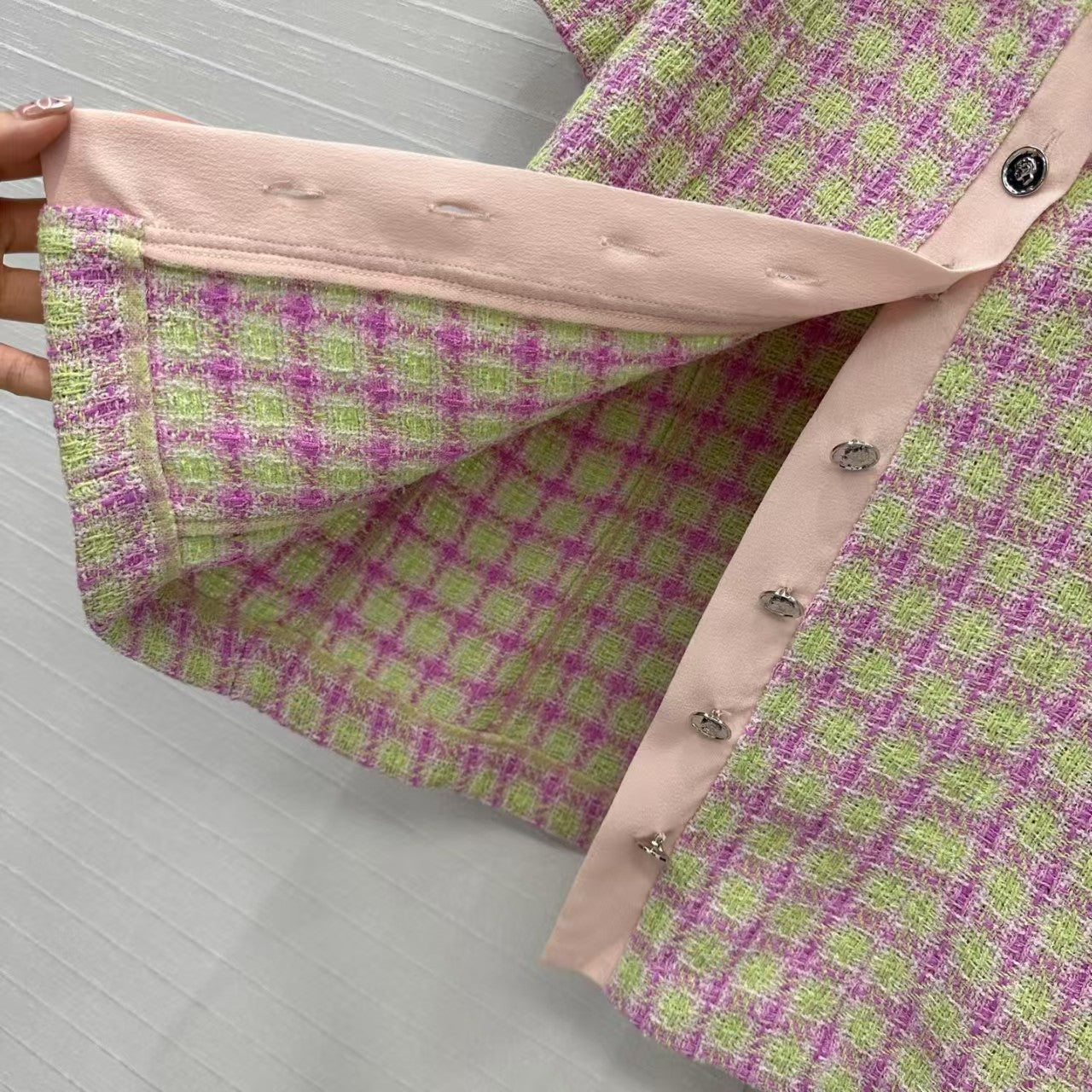 25s new product! The chaebol daughter style silk doll collar short-sleeved tweed top has a soft pink and green plaid pattern and a sweet and youthful feel. The slim fit and checkered cut make the upper body gentle and high-end, and it can be sweet or salty! 100% silk splicing, perfect workmanship, quality in details.